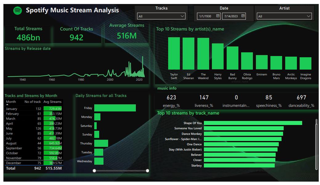 The Spotify Music Stream Analysis dashboard in Power BI provides a comprehensive view of streaming data, enabling users to understand listener behavior, track performance metrics, and uncover trends in music streaming. This dashboard leverages Power BI's powerful visualization and interactive capabilities to present insights in a user-friendly manner.