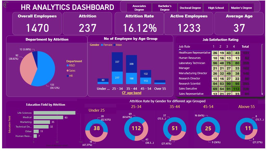 The HR analytics dashboard provides a comprehensive view of employee attrition, helping HR professionals and management understand the factors contributing to turnover and identify trends. It combines data visualization and key metrics to offer actionable insights.